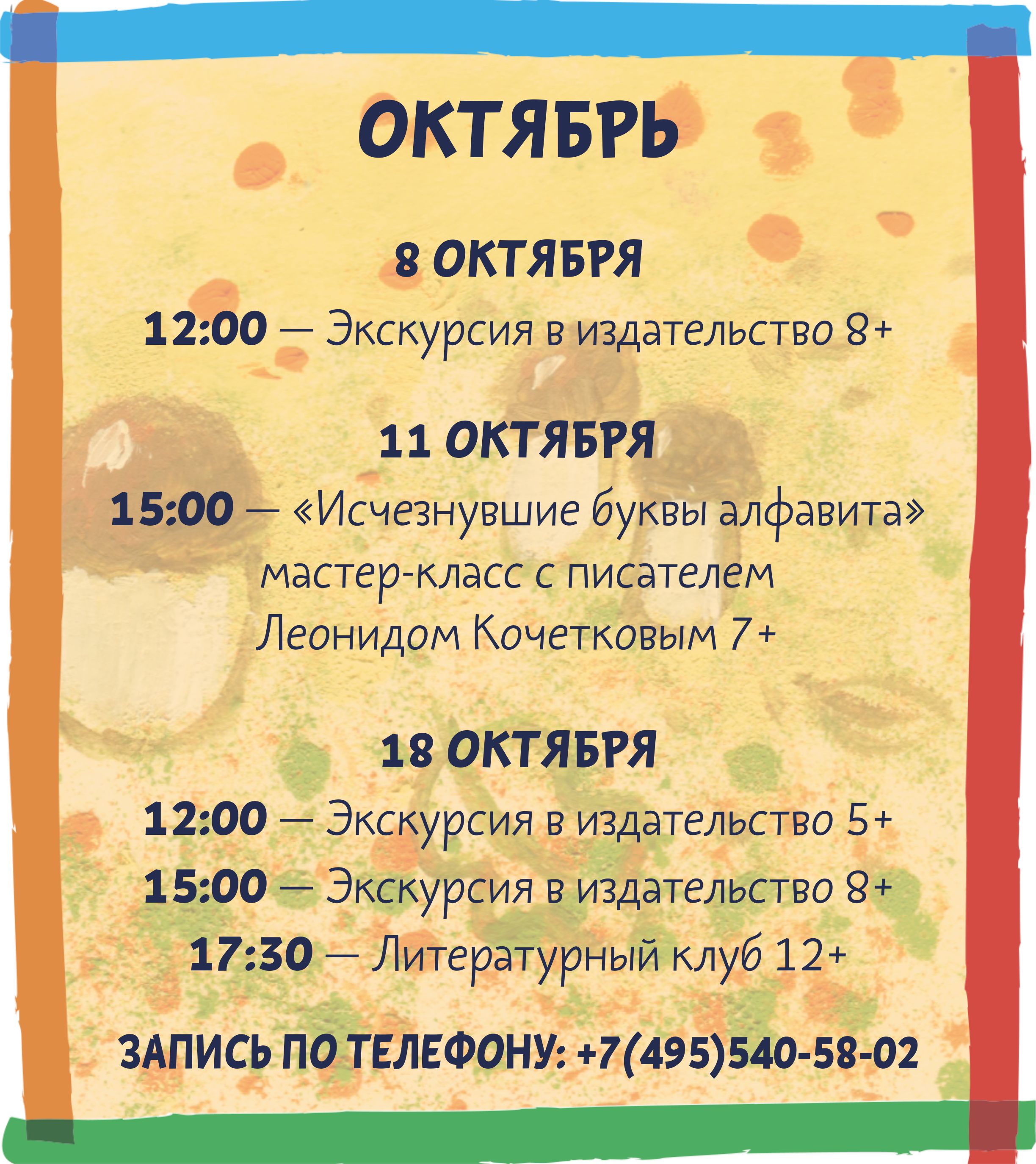 Запись производится только по телефону: +7 (495) 540-58-02Оплатить мероприятие необходимо в течение двух дней после записи, иначе бронь аннулируется.