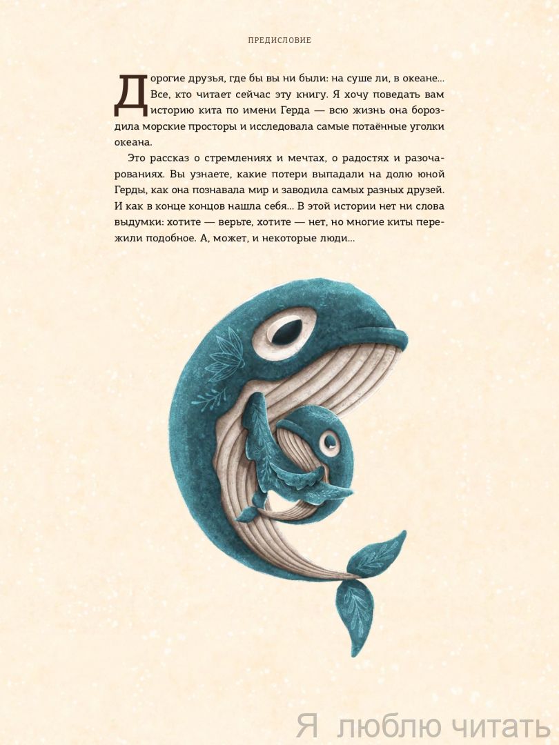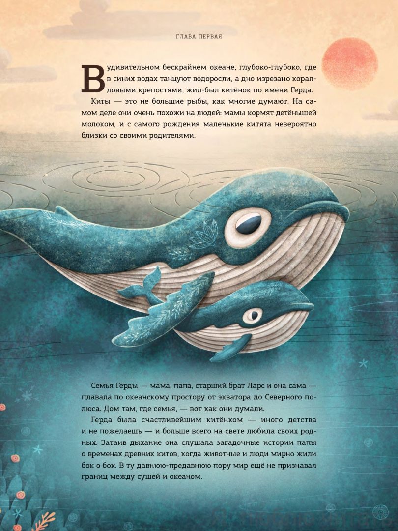 Герда - маленький китенок. Она живет в бескрайнем океане со своими родителями-китами и братом Ларсом. Однажды случилось страшное - семья китенка попала в руки китобоев, и Герда осталась совсем одна. Отважный китенок решает во что бы то ни стало разыскать своих родных и пускается в опасное путешествие - в воды крайнего севера. По пути она обретет новых друзей - касаток, пингвинов, чаек и даже большую белую медведицу. Найдет ли Герда свою семью? Это история о том, как маленький китенок Герда узнала, в каком удивительном мире живет, и обрела дом.
