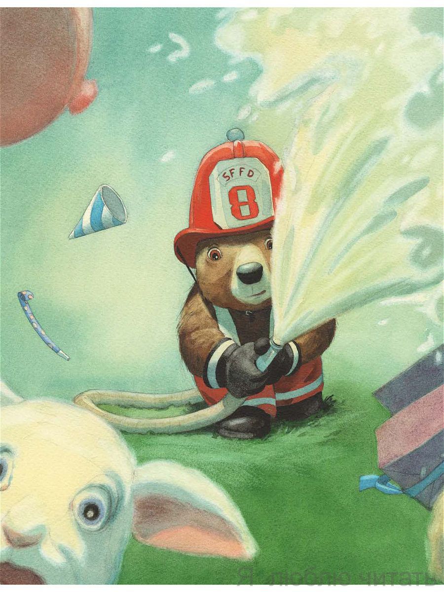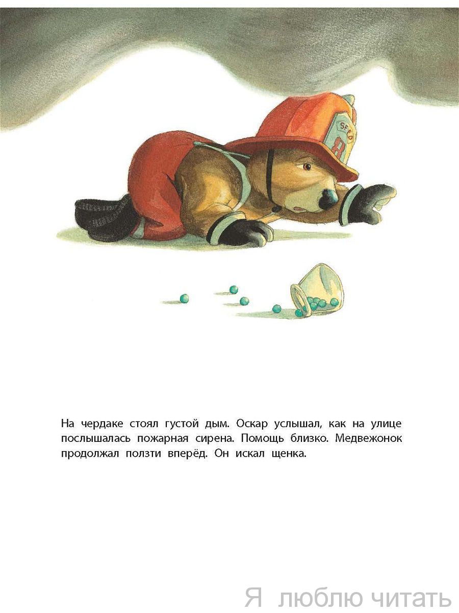Маленький медвежонок мечтал стать пожарным. Он целыми днями ходил в красном костюме и блестящем шлеме и с восторгом смотрел на настоящих пожарных, когда они смело мчались навстречу опасности. Малышу хотелось вместе с ними сражаться с огнём, но никто не просил его о помощи. И вот он уговорил маму купить ему маленький, но самый настоящий пожарный автомобиль. Поначалу незадачливый герой натворил немало бед, но в конце концов ему удалось совершить настоящий подвиг. Эту смешную историю придумал и нарисовал известный бельгийский художник Квентин Гребан, замечательные рисунки которого хорошо знают и любят малыши во многих странах мира.