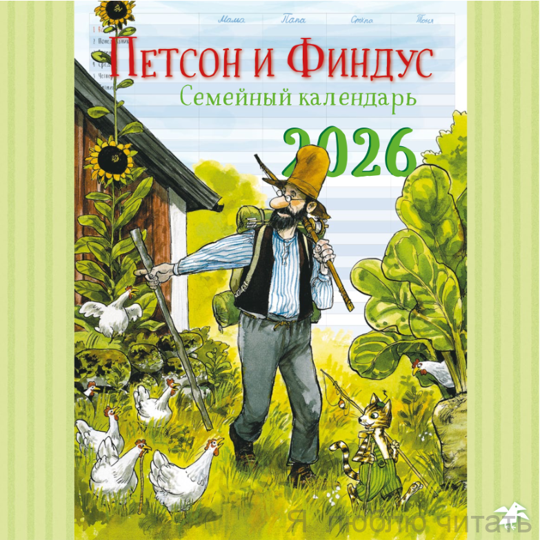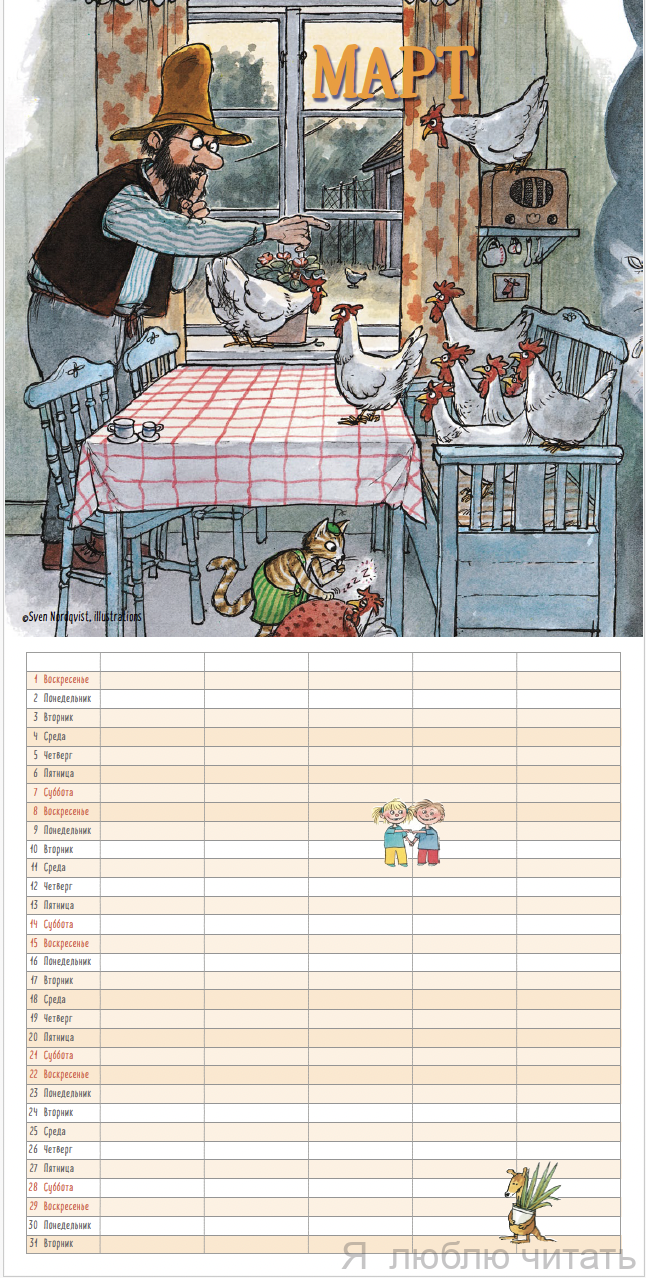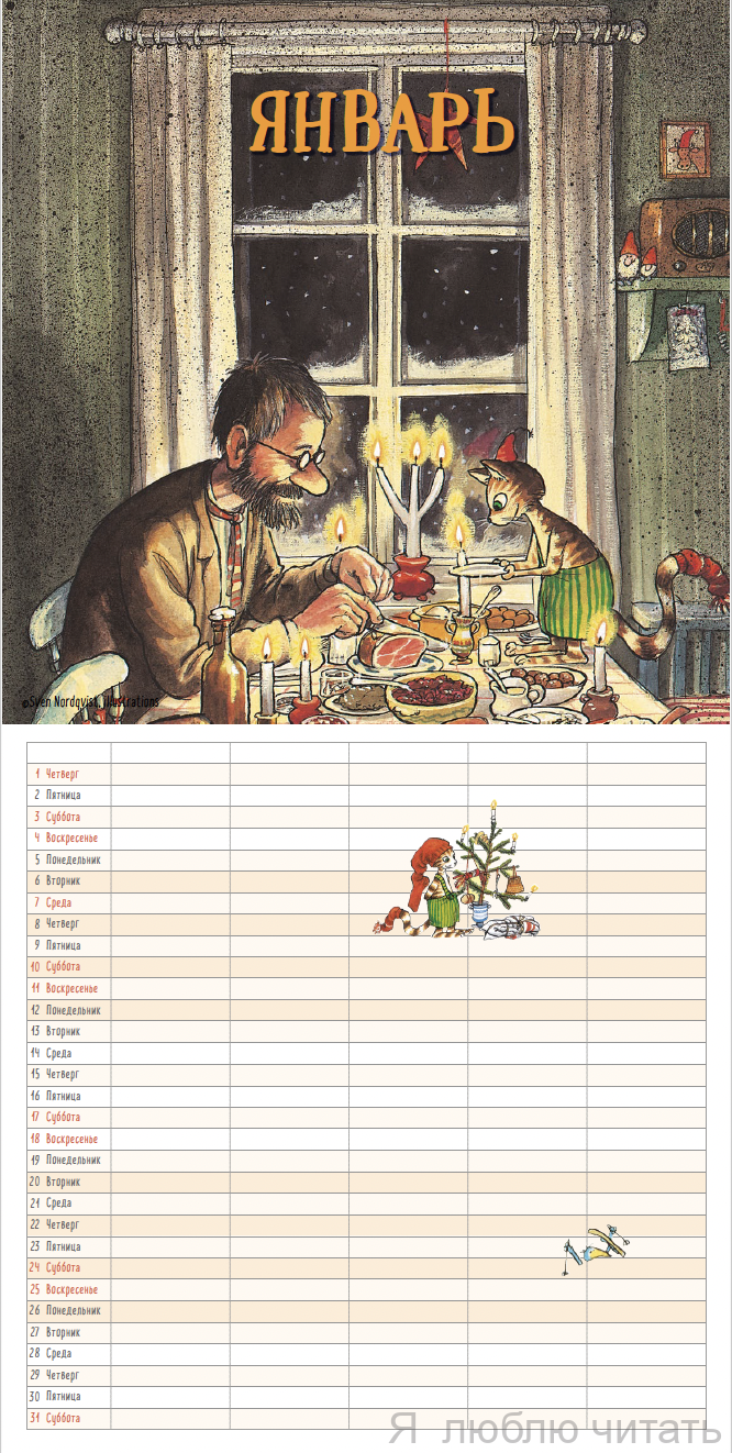 Каждый месяц в календаре начинается с картинки Свена Нурдквиста из книг о Петсоне и Финдусе. Календарь вешаются на гвоздик.