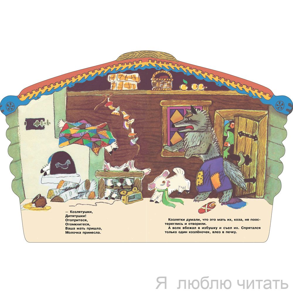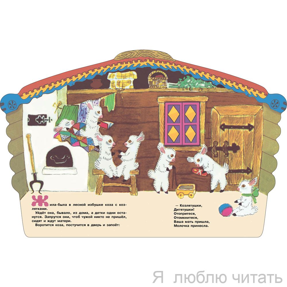 Хитрый серый волк всеми способами пытается заполучить на обед маленьких козлят! Осторожнее, ребятки! Берегитесь волка и слушайтесь маму! В книжке читателей ожидает сюрприз! На страницах есть открывающиеся окошки и дверь. Слушая сказку, ребенок может заглянуть в домик и посмотреть, что там делают герои.