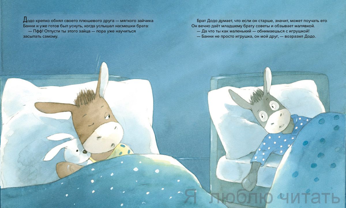 Эта книга посвящена маленьким добрым друзьям каждого малыша - мягким игрушкам. Они так малы, что их всегда можно взять с собой, а засыпая, так сладко сжимать их в объятиях. Ослик Додо уже почти взрослый, но он любит засыпать с игрушечным другом - плюшевым зайчиком Банни. Старший брат смеётся над Додо, говоря, что только малыши тащат в постель мягкие игрушки. И тогда Додо решает научиться засыпать самостоятельно. Он находит очень интересный способ. Может быть, он подойдёт и тебе.