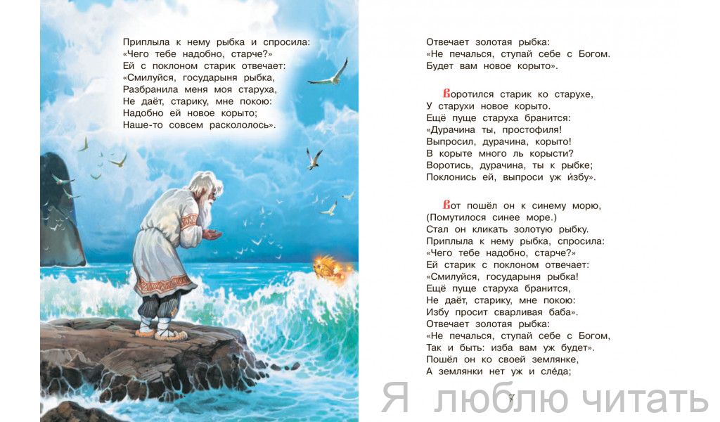Сказки Александра Сергеевича Пушкина с иллюстрациями Виктора Нечитайло. В сборник входят 2 самые известные сказки А.С. Пушкина «Сказка о рыбаке и рыбке» и «Сказка о золотом петушке». Сказка о золотой рыбке учит ребенка с самого раннего возраста не быть жадным, алчным, эгоистичным. Объясняет, что исполнение желаний не всегда приносит счастье. Сказка о золотом петушке учит ценить помощь и держать слово, быть благодарным и отличать добро от зла. В книге 32 страницы, напечатана на плотной белой бумаге с цветными иллюстрациями на каждой странице. Мягкая глянцевая обложка делает книгу удобной для чтения в дороге. Крупный шрифт подходит для самостоятельного чтения детьми дошкольного и младшего школьного возраста. Сказки входят в школьную программу по литературе.