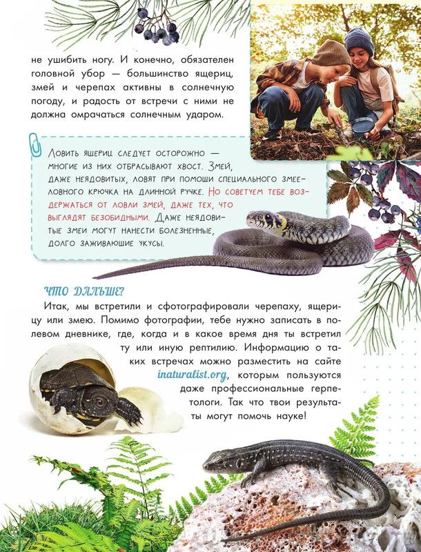 Кто-то восхищается красотой этих животных, кто-то боится. В нашей детской книге биолог, сотрудник Зоомузея Зоологического института РАН в Санкт-Петербурге Александр Острошабов понятно и легко рассказывает о самых интересных рептилиях — черепахах, змеях и ящерицах. Информация обязательно пригодится ребенку не только в школе на уроках биологии, но и во время отдыха, загородных походов, прогулок в парке. Яркие натуралистичные иллюстрации помогут лучше понять мир этих необычных существ и проникнуться к ним если не восхищением, то симпатией.