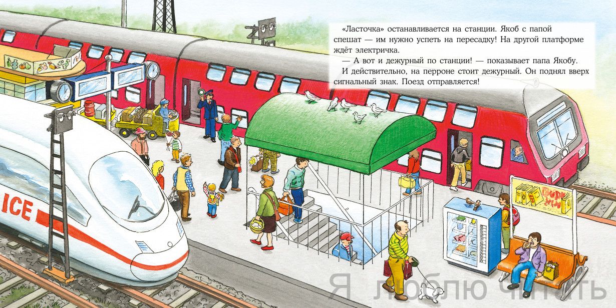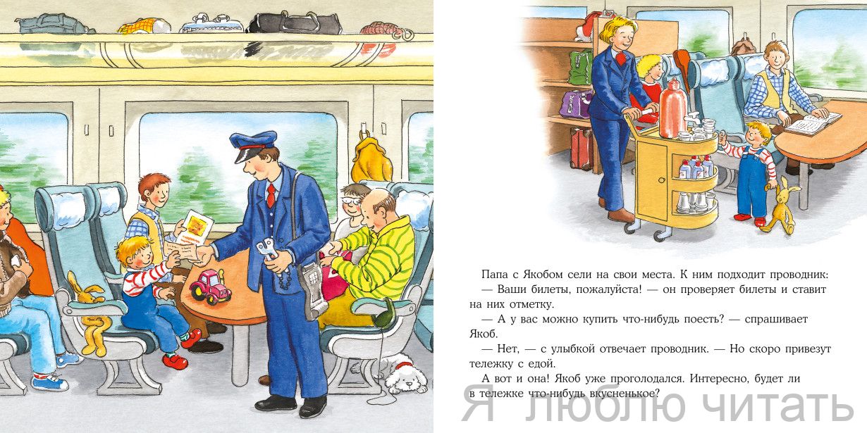 Книга-бестселлер из серии "Якоб — лучший друг Конни" поможет привить ребёнку интерес к путешествием и расскажет много нового о поездах и железной дороге.Сегодня Якоб едет к бабушке Фриде на поезде. Как стремительно он мчится по рельсам! По вагонам ходит проводник и проверяет билеты, а в специальной тележке можно купить всякие вкусности! Якоб в восторге от путешествия. Он готов бесконечно кататься на поездах!Вместе с Якобом ваш малыш заглянет в кабину машиниста, узнает много нового о поездах и поймёт, что путешествие — это очень увлекательно.Книга выполнена из плотного картона, страницы имеют скругленные углы для удобства и безопасности маленького читателя. Подходит для совместного чтения с детьми от 2 лет и старше.